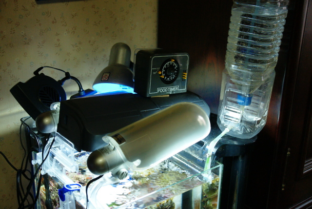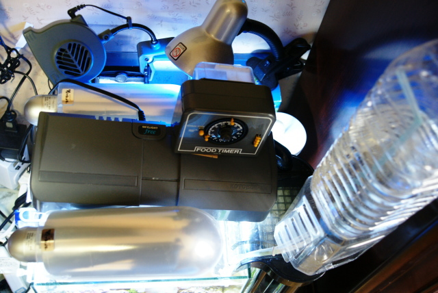 自動餌やり器は 14Wの蛍光灯の上にガムテープではりつけてあります。