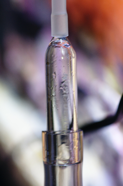 ポンプからのホースの径をエアーレーション用の細いチューブに変換するガラス状の