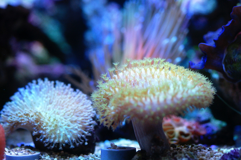 手前は 頂き物のイエローグリーンのウミキノコ。頂いた時より2廻りくらい成長しました。