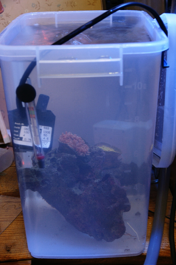 新海水と30センチ水槽からの元海水を混合で入れて 即席の避難所を作り、