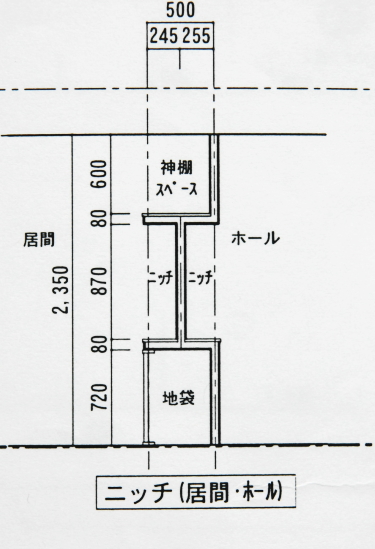 ドアの右隣りにあるのは 上は神棚・真ん中はニッチ・下は収納です。