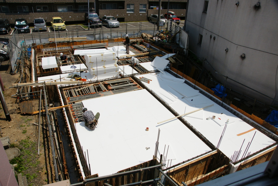 ↓ 6月24日 1階の床を作るために基礎配筋の上に型枠建込みをしていました。