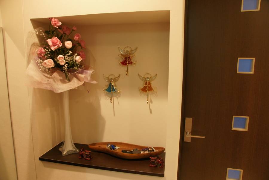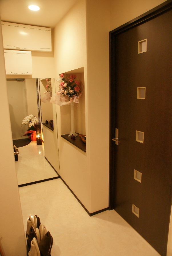 玄関横には 全身が写る鏡を設置してるので 照明なども写り込んで広さと明るさが倍増します。