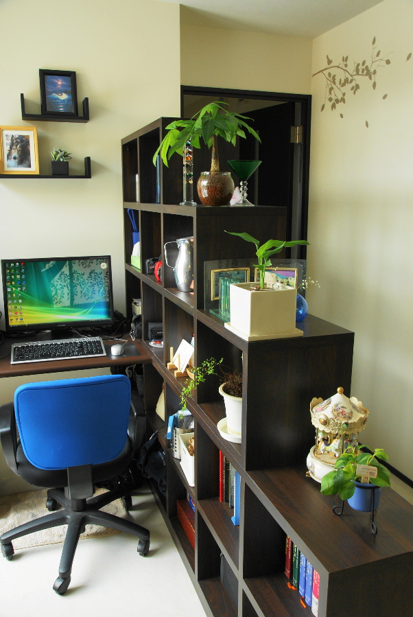 上の方は素通しになっているので 飾り棚として観葉植物や私の小物達を