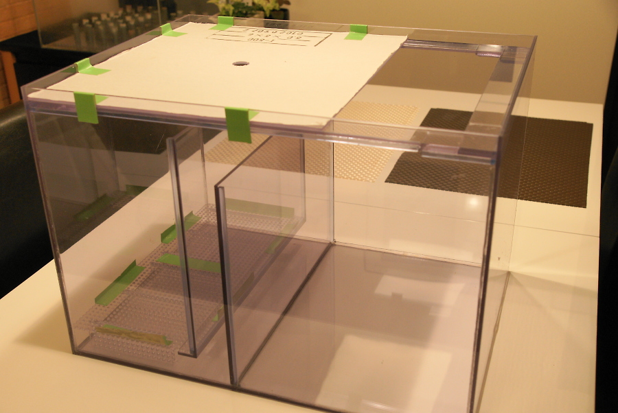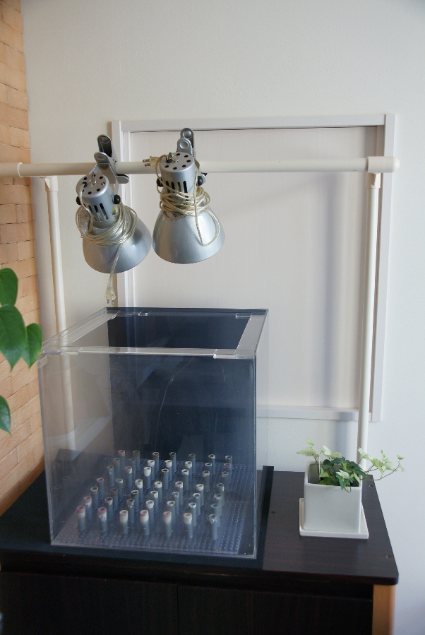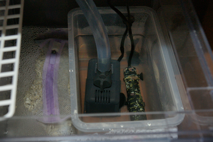 下の方にドライバーで穴をあけ、中に本水槽に水を戻すためのポンプやサーモスタット付きの
