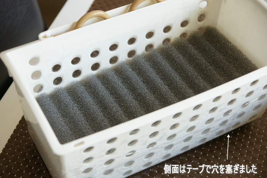 ↑ 穴が開いてるプラスチックの入れ物を加工して 下だけ穴を利用してウールボックスの代用。