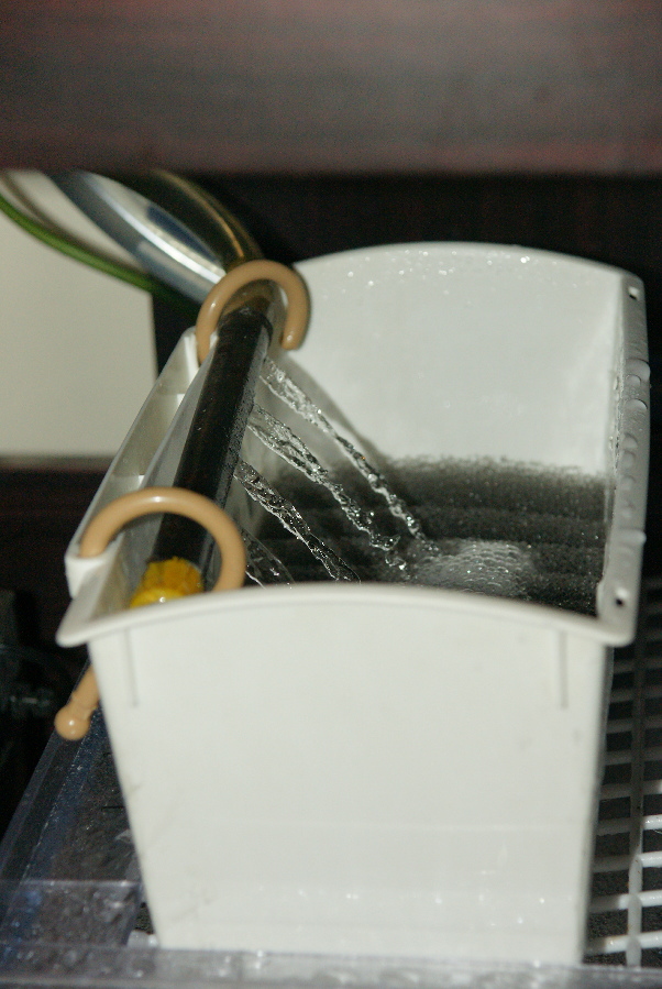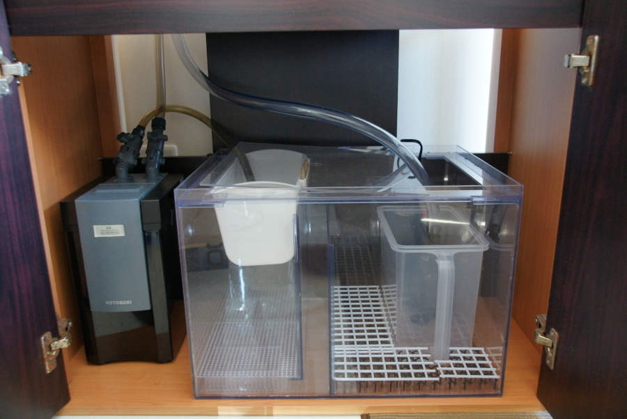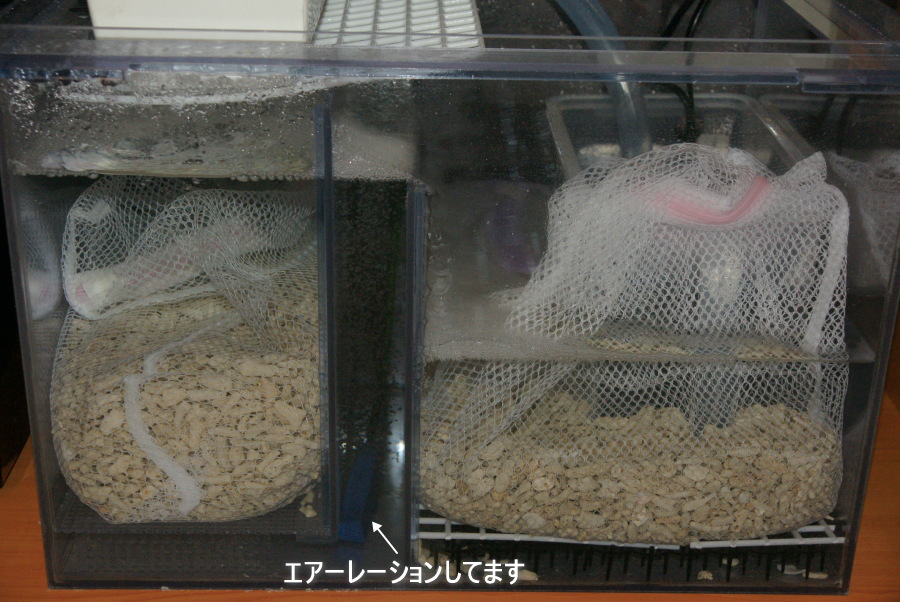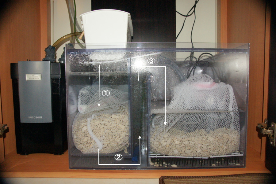 こんな感じで 濾過槽のサンゴ砂を潜り抜け、Rio1100のポンプで本水槽に戻る仕組み。